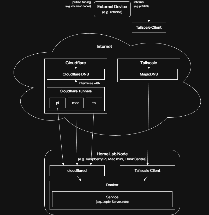 The device can connect to a service through two means: public-facing (accessing a domain like XXX.arash.codes) in which the request is routed through Cloudflare’s network (including its DNS records resolver and Tunnels) and internally in which the request is routed through Tailscale.